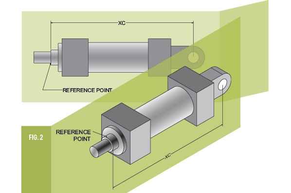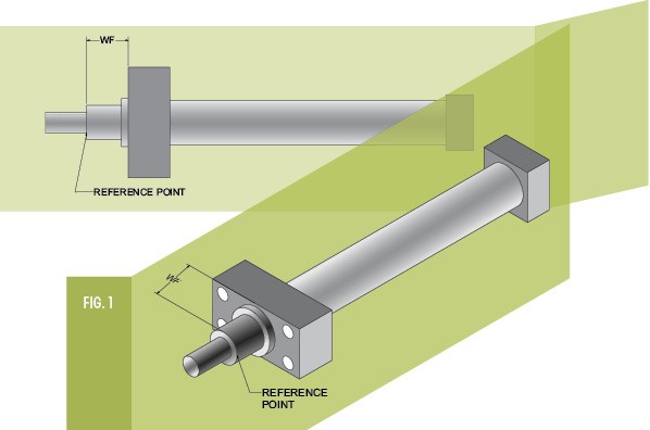 The ISO standards define the maximum overall size of the cylinder envelope, as well as the mounting dimensions with tolerances. In the case of flange mounts, the standards define the flange size, bolt pattern, bolt size, and the dimension to the piston rod connection point. Similar for a rear-clevis mount, the pin diameter, lug size, and dimension to the piston rod connection point is specified. In all cases, mounting dimensions, such as WF and XC (Figs. 1 & 2), are referenced to the shoulder (reference point) of the piston rod with the piston in the retracted position.